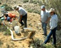 The next day, Saturday, May 20, we decided to explore the opposite side of Cache Creek. This is a hillside where past prospectors had stopped hydraulicing. Corky saw similarities in this material compared to hydraulicing that had been successfully done further down the Creek. Corky and I took some samples, panned it out, and found four to six small pieces of gold per pan. My little gold bible says, "Four or more pieces of gold per pan is a place to work." The hillside in this photo is a glacial moraine, and the gold is diluted throughout all the material. You can just barely see Corky in the upper left hand corner of the picture on the hillside in a dark colored coat. You can see the grove he carved in the hillside for material and to see if there was a terrace riverbed hidden under the overburden. Corky and I scraped the dry material off the top layer of the hillside, while Leonard, John, and Trevor operated the dry washer (the hardest task), which was powered by a small leaf blower. For such a small dry washer, it was working very well and moving a fair amount of material.