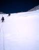 Jeff, Michael, and Roger forced their way up the forbidding snow and ice covered Denali peak by way of the traditional West Buttress route. They climbed alongside glass ice through Windy Corner, normally torn by ventura-effect winds, but which was totally calm for them. Above their camp at 14,200 feet, they scaled the Headwall, whose slope was as steep as 40 degrees, using ascenders attached to fixed ropes maintained by the National Park Service. At above 17,200 feet, they passed the tragic site of a Korean climbing team's demise, where eleven climbers lost their lives when they lost their footing and rolled to the bottom of a 6,000- to 7,000-foot chute named Rescue Gully, now remembered as The Orient Express. Often able to look back at triangular-shaped Mt. Foraker (17,400 feet) because of the clear weather, they continued up the Washburn Step, across the top of the Messner Couloir, along the partially rocky Summit Ridge, and finally managed the summit, where the trio celebrated for 20 minutes.