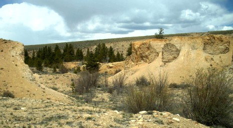 This photo was taken near the lower end of Cache Creek just south of Leadville on Friday, May 19, 2006, around 11:00 a.m. This land was privately owned, but as of last year it became BLM property. It can't be claimed but it can be mined recreationally. Leonard wanted to work further up the Creek, but the road is temporary gated for elk calving, so we are going to try down here. In this photo you can see the destruction left behind from hydraulic mining that was outlawed in Colorado in 1910, and I'm hoping they left some for us!