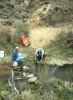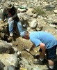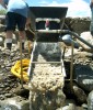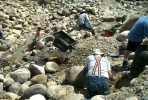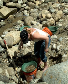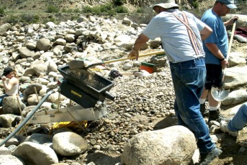 The next day, Saturday, May 20, we decided to explore the opposite side of Cache Creek. This is a hillside where past prospectors had stopped hydraulicing. Corky saw similarities in this material compared to hydraulicing that had been successfully done further down the Creek. Corky and I took some samples, panned it out, and found four to six small pieces of gold per pan. My little gold bible says, "Four or more pieces of gold per pan is a place to work." The hillside in this photo is a glacial moraine, and the gold is diluted throughout all the material. You can just barely see Corky in the upper left hand corner of the picture on the hillside in a dark colored coat. You can see the grove he carved in the hillside for material and to see if there was a terrace riverbed hidden under the overburden. Corky and I scraped the dry material off the top layer of the hillside, while Leonard, John, and Trevor operated the dry washer (the hardest task), which was powered by a small leaf blower. For such a small dry washer, it was working very well and moving a fair amount of material.