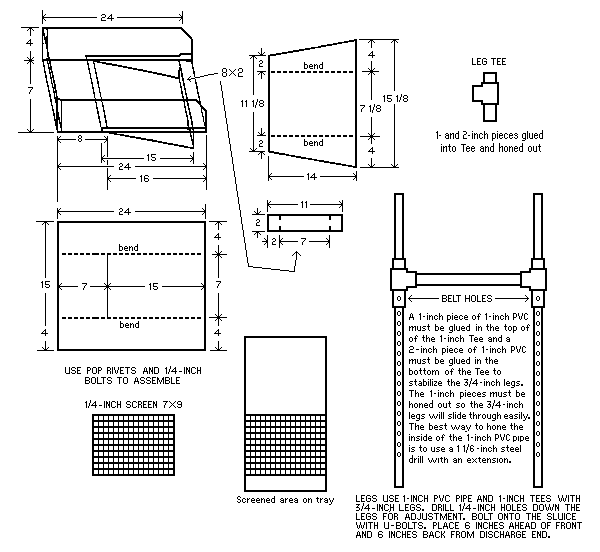 This hibanker/sluice was designed and tested by mechanical design engineer Chuck Cummins. For further information, contact Chuck Cummins at Scientific Engineering, 31013 Weld County Rd. 17, Windsor, CO. 80550. Telephone: 970-686-2238. E-mail: chuck2238@aol.com.