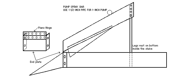 I started out with just an attachment to put on my existing sluice, so I could use it for a hibanker (or highbanker). By removing the legs and four quarter-inch bolts, I can use if for a standard sluice.