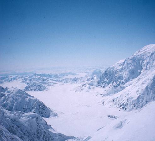 The National Park Service requires that each climbing expedition have a name for the climb of Denali. This team picked the name Commitment Squared (C2). C2 was airlifted to Kalhitna Glacier, near the seventh largest ice field in the world, euphemistically referred to as "Kalhitna International Airport." Their pilot was Kelly from McKinley Air Service (whose motto is "Two babes and a bird"). When Kelly was asked how many people you could fit in their plane, she replied, "Depends on how you pack 'em." It is well known that pilots don't measure their ages in years but rather in how many plane crashes they've survived! Just before landing on the glacier, the plane dived through "One Shot Pass" with 150 feet of space to spare off of each wing tip and flew over the airplane graveyard at the bottom of the pass.