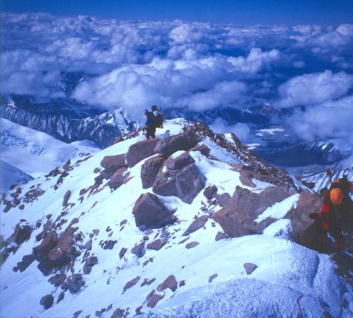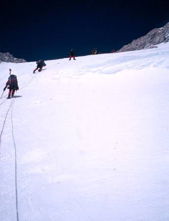 Jeff, Michael, and Roger forced their way up the forbidding snow and ice covered Denali peak by way of the traditional West Buttress route. They climbed alongside glass ice through Windy Corner, normally torn by ventura-effect winds, but which was totally calm for them. Above their camp at 14,200 feet, they scaled the Headwall, whose slope was as steep as 40 degrees, using ascenders attached to fixed ropes maintained by the National Park Service. At above 17,200 feet, they passed the tragic site of a Korean climbing team's demise, where eleven climbers lost their lives when they lost their footing and rolled to the bottom of a 6,000- to 7,000-foot chute named Rescue Gully, now remembered as The Orient Express. Often able to look back at triangular-shaped Mt. Foraker (17,400 feet) because of the clear weather, they continued up the Washburn Step, across the top of the Messner Couloir, along the partially rocky Summit Ridge, and finally managed the summit, where the trio celebrated for 20 minutes.