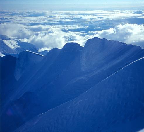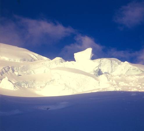 Denali tops out at 20,320 feet at the South Peak. The North Peak is slightly lower at 19,470 feet. Together, these peaks are called the Churchill Peaks. To give you an idea of the height from the base of the mountain to the summit, it is one and a half times the distance from the base to the summit of Mt. Evans! Denali is an Athabascan Indian name meaning "The High One." Denali is now the name recognized by the State of Alaska's Geographic Names Board for Mt. McKinley, North America's highest mountain. The mountain was named for Senator William McKinley, who later became the 25th President. It also is located just 240 miles south of the Arctic Circle from where it picks up the freezing Arctic winds leaving just eight weeks of seasonal climbing from mid May to early July. Yet, the peak is still so popular, seventy percent of Denali climbers come from outside the United States! In 2001, Denali, which has some of the worst weather in the world, happened to have best weather ever recorded for climbing.